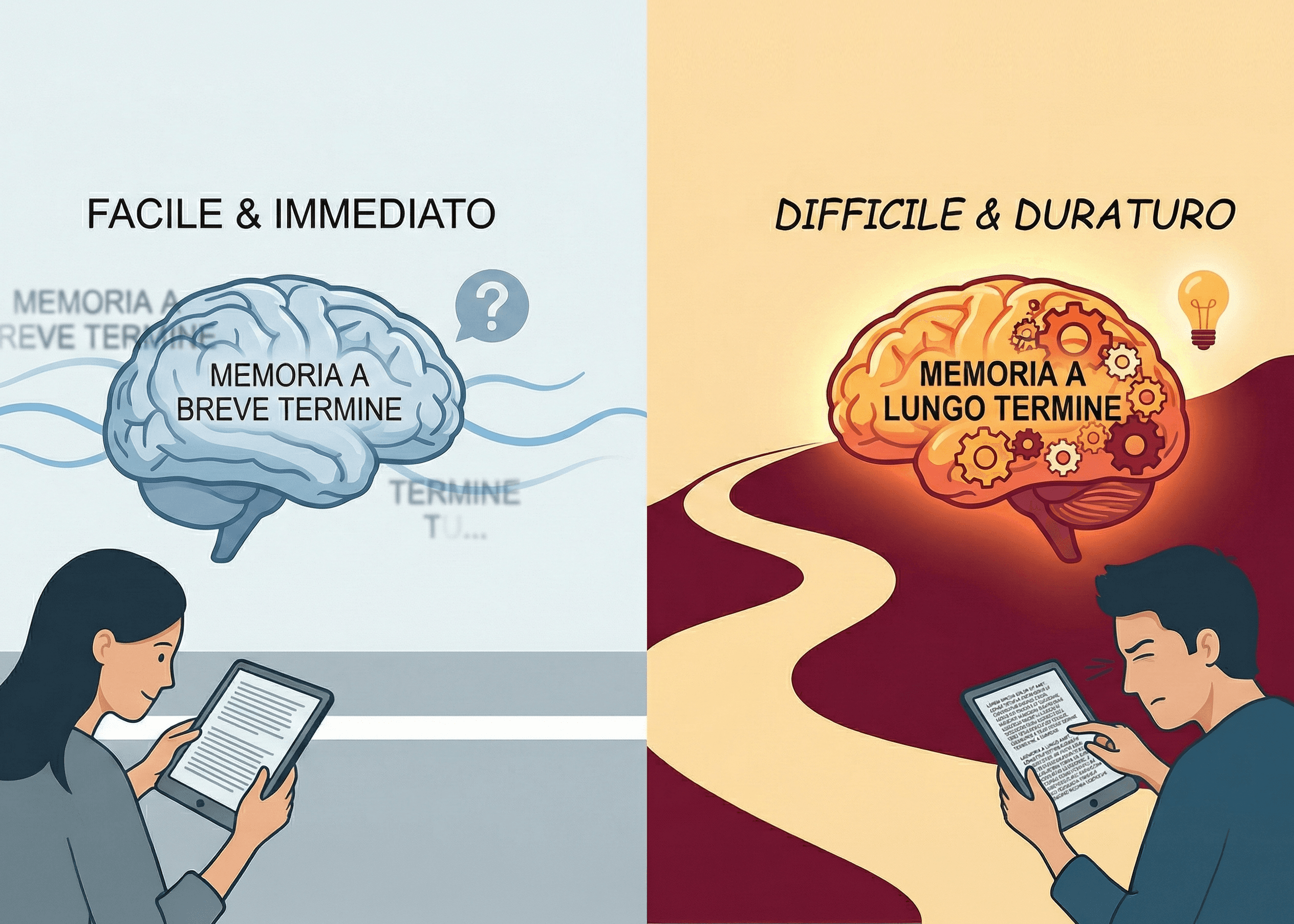 Al contrario, un testo che richiede un piccolo sforzo aggiuntivo attiva processi cognitivi più profondi: maggiore attenzione, elaborazione più accurata, integrazione con conoscenze pregresse. In altre parole, l’inciampo visivo diventa un allenamento.La "disfluenza" (difficoltà di lettura), infatti, forza il cervello a passare da un’elaborazione automatica e superficiale a una cognitiva più lenta, attiva e attenta.